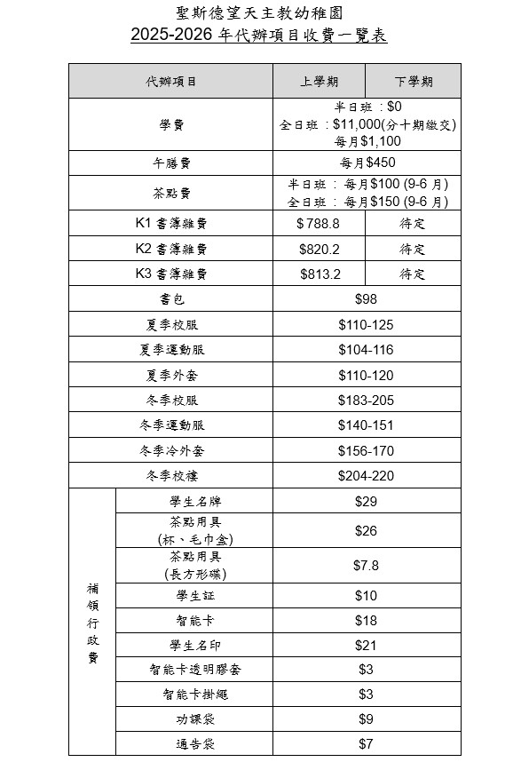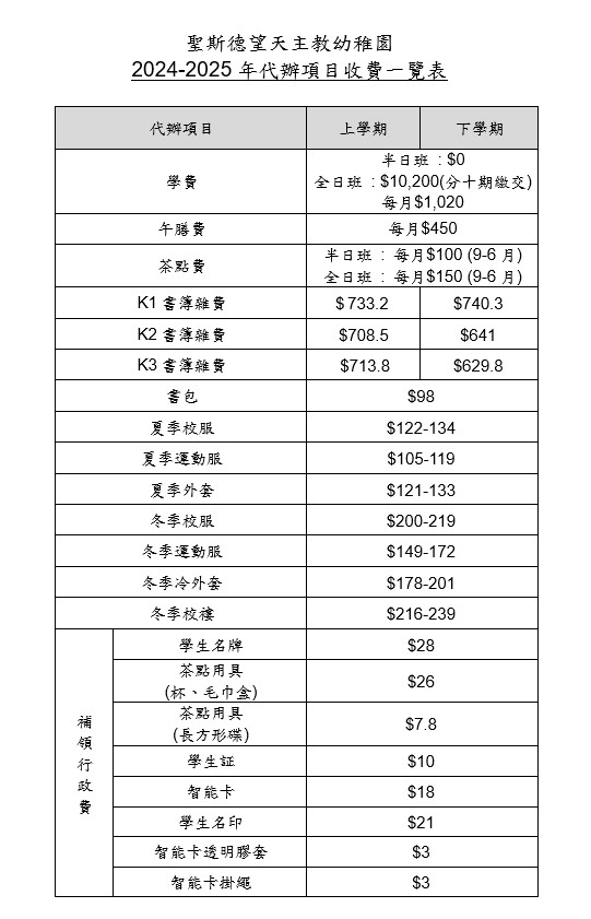 本校已參與「免費優質幼稚園教育計劃」,因此半日班的學費為$0